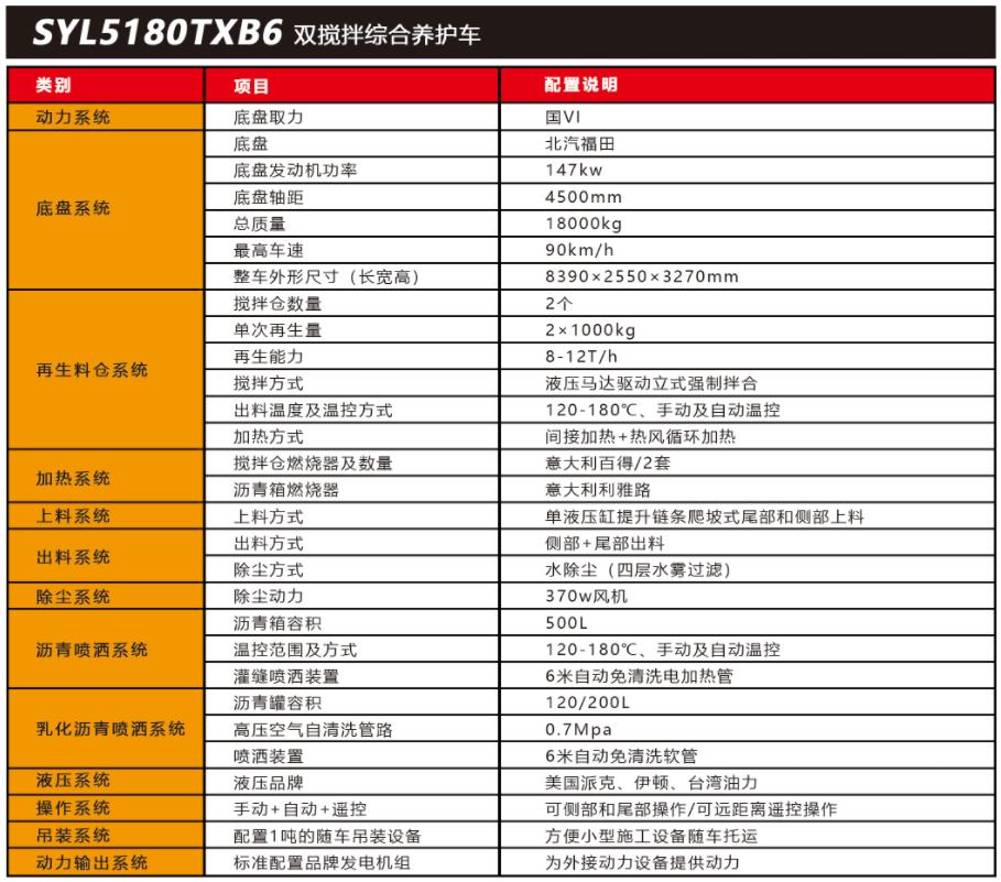 SYL5180TXB6 雙攪拌路面綜合養(yǎng)護(hù)車是一款集現(xiàn)場(chǎng)生產(chǎn)新瀝青混合料、瀝青路面冷 料、舊料、銑刨料 100%現(xiàn)場(chǎng)加熱再生利用,熱瀝青灑布、裂紋跟蹤灌縫、乳化瀝青噴灑、 為其他裝置提供電力和液壓動(dòng)力等多種功能于一體的瀝青路面熱再生綜合養(yǎng)護(hù)車。可實(shí)現(xiàn) 多場(chǎng)合、多路面的各種類養(yǎng)護(hù)作業(yè) ,養(yǎng)護(hù)修補(bǔ)費(fèi)用低 ,作業(yè)快捷 ,高效率、節(jié)能環(huán)保性能突出等特點(diǎn)。適用于多種路況的中大施工量和高速公路的修補(bǔ)施工。